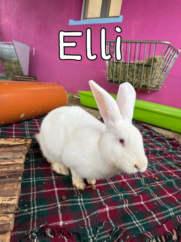 Elli ist das einzige Albino-Kaninchen unter den Deutschen-Riesen-Mädels. Genauso einzigartig wie ihr Aussehen ist auch ihre Persönlichkeit. Sie ist sehr neugierig und irgendwie auch ein bisschen verrückt. Sie schaut sich immer alles zuerst mit ihrem Mund an, bevor sie mit der Nase oder dem Kopf denkt. Außerdem liebt sie es, mit den anderen Mädels zu kuscheln, ist aber ab und zu auch gerne bei kleinen Streitigkeiten mit dabei.